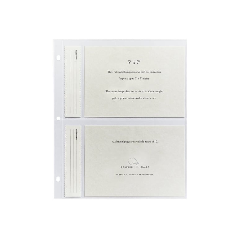 Main view Product Details Graphic Image® Genuine Graphic Image™ slip-in 5x7 pocket refills for Standard 3-ring albums — From Graphic Image™ these refill pages will meet and exceed the preservation and presentation requirements of your most important keepsakes and pictures.Archival quality polypropylene pages that are heavy weight and super clear. Pages won't wrinkle or harm photos.Package is a set of 10 leaves which hold 40 - 5"x7" prints. These are refills meant especially for Post Impression / Graphic Image™ albums; they may fit other standard 3-ring binders as well.Graphic Image™ hand crafts genuine leather-bound books that have set the modern day standard for quality and design. Genuine Graphic Image™ slip-in 5x7 pocket refills for Standard 3-ring albums Graphic Image® FALL CELEBRATION Savings - ends Sunday: Buy More / Save More * Add this item to your cart for the full details of this promotion. Conditions may apply. Model #611959760190 List $17.50 You pay $14.95 In stock Can be shipped today [?] Your Price Match is Active Your request for a price of $0.00 for a minimum quantity of has been accepted. You have [time] left to purchase this item for $0.00 instead of $14.95 each. Find a Lower Price? We BEAT All Authorized Retailers [?] Approx. Overall Dimensions:9 1/2"x11 1/2" SHARE THIS ITEM Share on Facebook