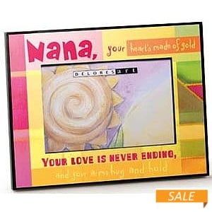 Product Details Russ Berrie US Gift, Inc. Give GRANDMA a thrill with our colorful Nana frame — Your NANA will LOVE this colorful wood frame. Beautifully scripted with the endearing: Nana, your heart's made of gold, your love is never ending, and your arms hug and hold Attractive easel back for tabletop display.Crafted by Russ Berrie®, the Gift people. Give GRANDMA a thrill with our colorful Nana frame Model #039915317712 List $16.50 You pay $7.90 In stock Your Price Match is Active Your request for a price of $0.00 for a minimum quantity of has been accepted. You have [time] left to purchase this item for $0.00 instead of $7.90 each. Find a Lower Price? We BEAT All Authorized Retailers [?] FEATURESDisplays:4"x6"Material:Wood (mdf/engineered)Finish:Multi-ColorOccasion:Christmas, Grandparent`s Day, Mother`s DayStyle:Contemporary, Words & whimsy, Sentiments | ready madeOrientation:Horizontal OnlyBrand:Russ Berrie US Gift, Inc.Display Type:Desktop Only This item ships in its own box SHARE THIS ITEM Share on Facebook