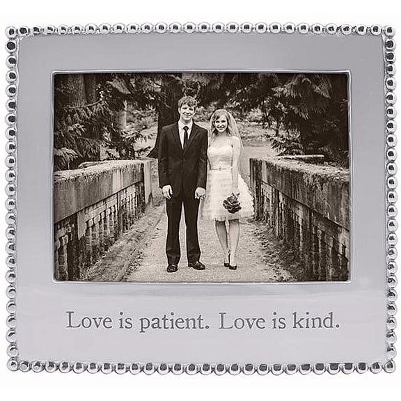 Main view Many Styles to choose from Personalize Gifts for every occasion Let us Engrave One for you Product Details Mariposa® LOVE IS PATIENT. LOVE IS KIND. Statement frame crafted by Mariposa® — Show your LOVE with Mariposa's "Love is patient. Love is kind" special frame. Everything that Mariposa® does is original. Their belief that design is essential to a modern vision of life celebrates the voluptuous forms and ever-new textures of aluminum. Mariposa® pieces have an enormous range of themes and moods. People love the Mariposa casual, sculpted elegance — a strong, virtually carefree material. Their artisan handcrafted look in recycled aluminum is both pleasing to the eye and touch, as well as 100% ecologically sound. SendAFrame stocks the entire Mariposa® picture frame line, click: Mariposa® Design Collection Important Note: Mariposa items are hand engraved. Your piece may differ slightly from the photo. LOVE IS PATIENT. LOVE IS KIND. Statement frame crafted by Mariposa® Mariposa® WINTER CELEBRATION Savings - Buy More / Save More * Add this item to your cart for the full details of this promotion. Conditions may apply. Model #808813150314 $81.00 only 4 left, order soon. This item IS in stock and can be expected to ship 01/23/2026 In stock Your Price Match is Active Your request for a price of $0.00 for a minimum quantity of has been accepted. You have [time] left to purchase this item for $0.00 instead of $81.00 each. Find a Lower Price? We BEAT All Authorized Retailers [?] FEATURESDisplays:5"x7"Material:AluminumFinish:SilverOccasion:Anniversary, Friendship, Romantic, Valentine`s Day, WeddingStyle:Contemporary, Eco-Friendly-Recycled, Modern, Romantic, Santa Fe, Sophisticated, Words & whimsy, Sentiments | ready made, BohoOrientation:Horizontal OnlyBrand:Mariposa®Display Type:Desktop Only Approx. Overall Dimensions:8 3/4"x7 3/4" This item ships in its own box SHARE THIS ITEM Share on Facebook