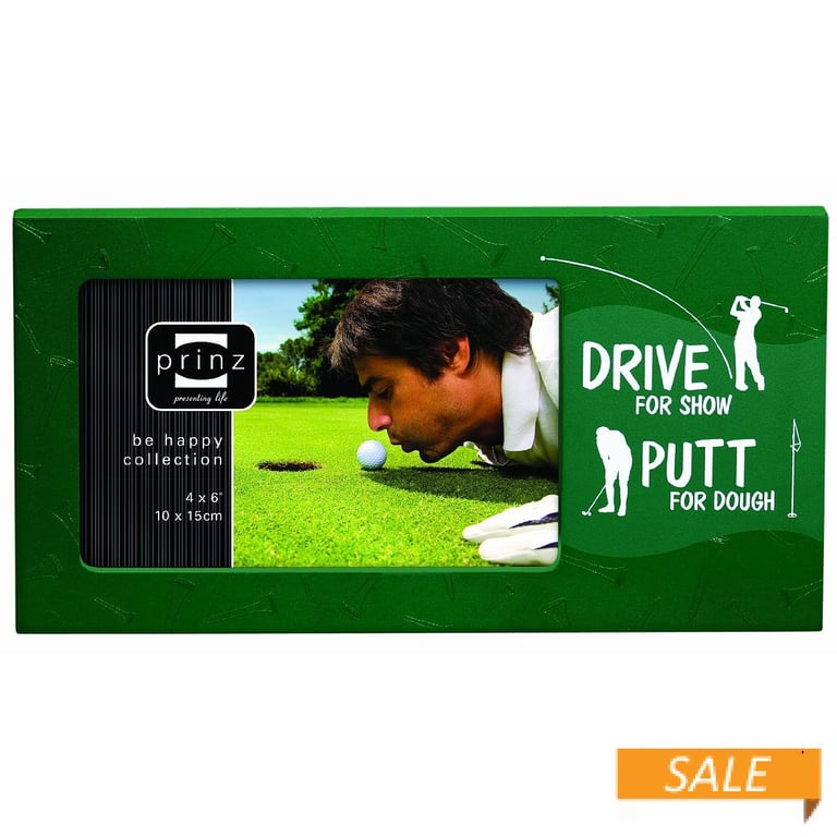 Product Details Prinz® frames & albums DRIVE - PUTT wooden frame for your golf group by Prinz® — For the golfer in your life we have a special frame. DRIVE FOR SHOW PUTT FOR DOUGH Handsomely displays a 6" x 4" print. Hardboard easel back for tabletop display. Wall hooks included for easy hanging. Quality glare resistant picture frame glass lens.Made by the PRINZ® Company of Illinois. DRIVE - PUTT wooden frame for your golf group by Prinz® Model #086981749145 List $14.00 You pay $6.90 In stock Your Price Match is Active Your request for a price of $0.00 for a minimum quantity of has been accepted. You have [time] left to purchase this item for $0.00 instead of $6.90 each. Find a Lower Price? We BEAT All Authorized Retailers [?] FEATURESDisplays:4"x6"Material:Wood (full grain)Finish:GreenOccasion:Birthday, Corporate gifts, RetirementStyle:Sports & leisureOrientation:Horizontal OnlyBrand:Prinz® frames & albumsDisplay Type:Desktop Only This item ships in its own box SHARE THIS ITEM Share on Facebook