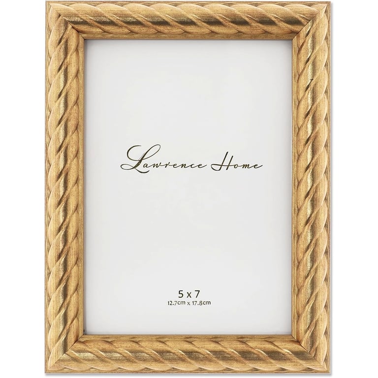 Main view Product Details Lawrence Frames® GOLD ROPE-TWIST 5x7 polystyrene frame — A burnished ROPE-TWIST silhouette in polystyrene gives this style a traditional look. Gold finish never needs care - just a wipe with damp cloth.Hardboard backed with dual easel for portrait or landscape display. Glare resistant glass lens.Crafted by Lawrence®. GOLD ROPE-TWIST 5x7 polystyrene frame Model #751148094191 List $19.50 You pay $15.95 This item IS in stock and can be expected to ship 02/23/2026 Your Price Match is Active Your request for a price of $0.00 for a minimum quantity of has been accepted. You have [time] left to purchase this item for $0.00 instead of $15.95 each. Find a Lower Price? We BEAT All Authorized Retailers [?] FEATURESDisplays:5"x7"Material:Acrylic | ResinFinish:GoldOccasion:Business & office, Good luck, Home decorating, Thank-Motivate-Reward, Celebrating Travels, BirthdayStyle:Classic, OrnateOrientation:BothBrand:Lawrence Frames®Display Type:Desktop or Wall Approx. Overall Dimensions:6 1/2"x8 1/2" This item ships in its own box SHARE THIS ITEM Share on Facebook