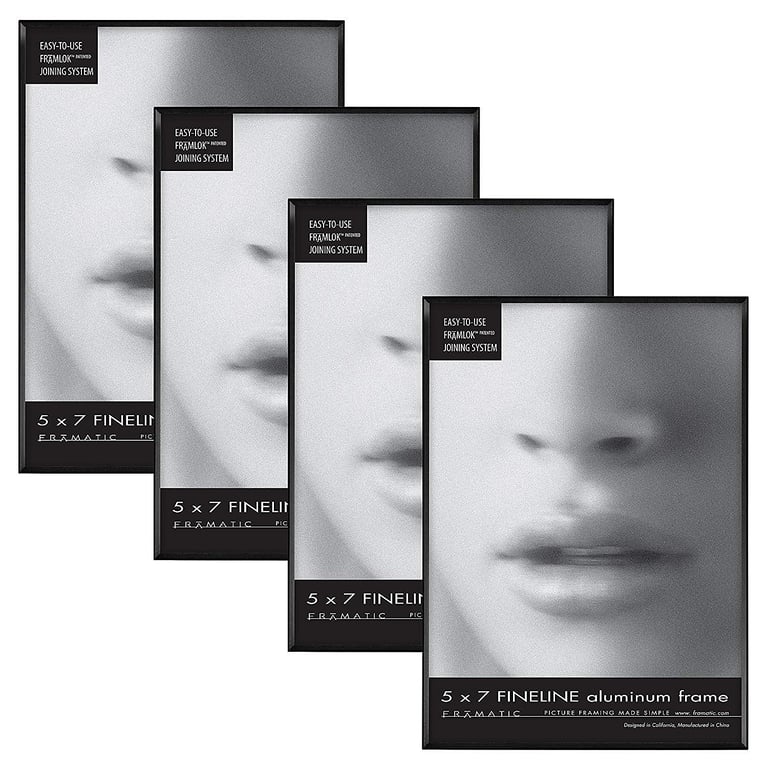 Main view Reverse (sample) Framelok System Product Details Framatic FINELINE Black Aluminum 5x7 by Framatic® (4pack) — Use the Framatics® FINELINE series for flattering, minimal, contemporary presentation of your art or prints. Thin aluminum frame is an elegant way to display photos and artwork Black finish Patented 'FRAMLOK' assembly system allows you to easily insert photo or artwork Polished edge glass Detachable easel back for tabletop display Includes an adjustable hanger for either vertical or horizontal wall display Crafted by FRAMATIC®. FINELINE Black Aluminum 5x7 by Framatic® (4pack) Model #716242021627 List $105.00 You pay $80.95 In stock Can be shipped today [?] Your Price Match is Active Your request for a price of $0.00 for a minimum quantity of has been accepted. You have [time] left to purchase this item for $0.00 instead of $80.95 each. Find a Lower Price? We BEAT All Authorized Retailers [?] FEATURESDisplays:5"x7"Material:AluminumFinish:BlackOccasion:Business & office, Home decoratingStyle:Architectural, Contemporary, MinimalOrientation:BothBrand:FramaticDisplay Type:Desktop or Wall Approx. Overall Dimensions:5 1/8"x7 1/8"x1" This item ships in its own box SHARE THIS ITEM Share on Facebook