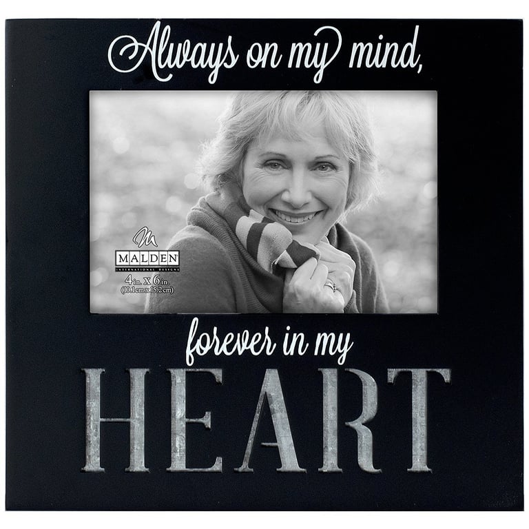 Product Details Malden Designs® ALWAYS ON MY MIND ... FOREVER IN MY HEART by Malden® — Always on my mind, forever in my HEART Wood with silkscreened design and laser-cut galvanized metal accents. Hardboard easel back for landscape tabletop display. Displays a 6"x4" photo. Glare resistant glass lens.Produced by Malden International Designs®. ALWAYS ON MY MIND ... FOREVER IN MY HEART by Malden® Malden Designs® FALL CELEBRATION Savings - ends SundayBuy More / Save More * Add this item to your cart for the full details of this promotion. Conditions may apply. Model #096287145909 List $18.50 You pay $14.95 In stock Can be shipped today [?] Your Price Match is Active Your request for a price of $0.00 for a minimum quantity of has been accepted. You have [time] left to purchase this item for $0.00 instead of $14.95 each. Find a Lower Price? We BEAT All Authorized Retailers [?] Approx. Overall Dimensions:8 3/4"x8 1/4"x7/8" This item ships in its own box SHARE THIS ITEM Share on Facebook