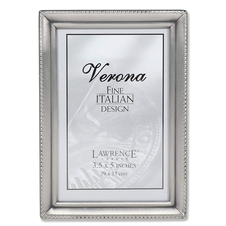 Main view Product Details Lawrence Frames® Satin antiqued pewter w/caviar bead trim 3.5x5 frame — Beaded antiqued pewter frame is nicely crafted with invisible seams and corners.Attractively backed for wonderful desk appeal.Dual easel back for portrait or landscape tabletop display. Glare resistant glass lenses. Edge measures 3/8" wide all around.By Lawrence®. Click the Lawrence Frame collection to shop the entire line. Satin antiqued pewter w/caviar bead trim 3.5x5 frame Model #751148035002 List $17.00 You pay $13.95 This item IS in stock and can be expected to ship 01/30/2026 In stock Your Price Match is Active Your request for a price of $0.00 for a minimum quantity of has been accepted. You have [time] left to purchase this item for $0.00 instead of $13.95 each. Find a Lower Price? We BEAT All Authorized Retailers [?] FEATURESDisplays:3.50"x5"Material:Pewter (plate)Finish:SilverOccasion:Anniversary, Birthday, Good luck, Mother`s Day, Retirement, Teacher gifts, Thank-Motivate-Reward, Celebrating Travels, WeddingStyle:Antique, Classic, TraditionalOrientation:BothBrand:Lawrence Frames®Display Type:Desktop or Wall This item ships in its own box SHARE THIS ITEM Share on Facebook